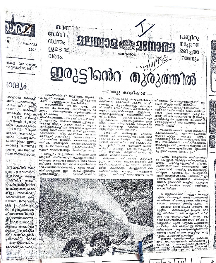 On November 13, 1973, the Malayala Manorama newspaper published the first article in an illustrated series titled “In the Island of Darkness” with an article called “The Man Who Doesn’t See People.” This series highlighted the primitive tribe known as the Cholanaikkans who lived in the Manjeri forest in the Karulai Forest Range in Eranad Taluk, Malappuram district. The articles were thought-provoking for readers, as this tribe had not been included in any previous census records.